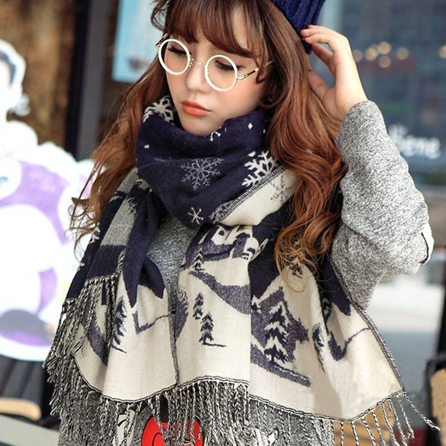 ファションカジュアルの雪花柄トナカイ柄付きのソフトで快適な大きめマフラーストールです。肌寒い時期に欠かせない便利アイテムが登場!ふわふわ暖かいマフラーです。大判なので肩にかけても首に巻いてもOK!秋冬のコーディネートには大活躍します。